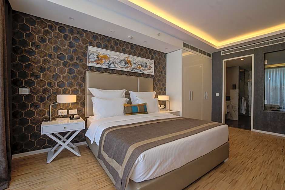 Step into exquisite luxury with our Ambassador Suite, a grand 92-square-yard retreat designed for ultimate comfort and elegance. This suite features two beautifully appointed bedrooms: a sumptuous king-size bedroom and a versatile twin bedroom, both offering breathtaking full panoramic sea views. Enjoy a spacious seating area, ideal for relaxation and entertaining, as well as a separate dining area for intimate meals. The suite includes two well-appointed bathrooms, one of which features a lavish Jacuzzi for ultimate relaxation. A well-equipped kitchenette with a dishwasher and a coffee machine adds to the convenience. With its sophisticated design and premium 5-star amenities, the Ambassador Suite promises an exceptional stay where every detail is crafted for luxury and convenience.